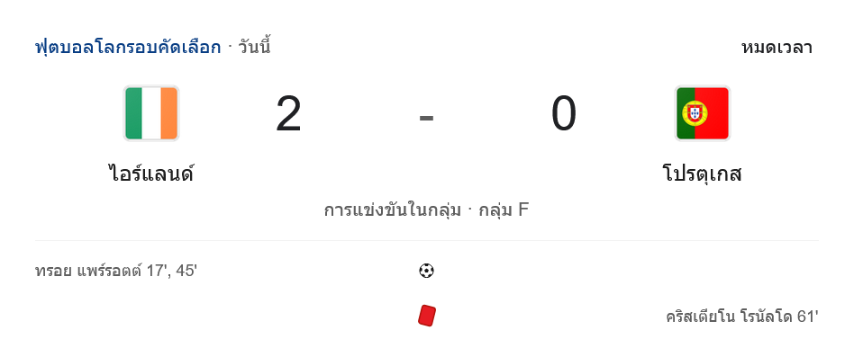 ท้ายเกมโปรตุเกสมีลุ้นจากลูกโหม่งของ กอนซาโล รามอส และยิงไกลของ วิตินญา แต่ ควีวีน เคลเลเฮอร์ เซฟเอาไว้ได้ทั้งหมด ขณะที่ฝั่งไอร์แลนด์เองก็ถอยทั้งแผง เน้นปิดช่องมากกว่าหาเพิ่ม สุดท้ายจบ 90 นาที ไอร์แลนด์ย้ำชัย 2-0 เก็บสามแต้มสำคัญในบ้าน แบบที่แฟนสาย บ้านผลบอล ต้องขยี้ตาดูสถิติอีกครั้งว่าไม่ได้พิมพ์ผิด