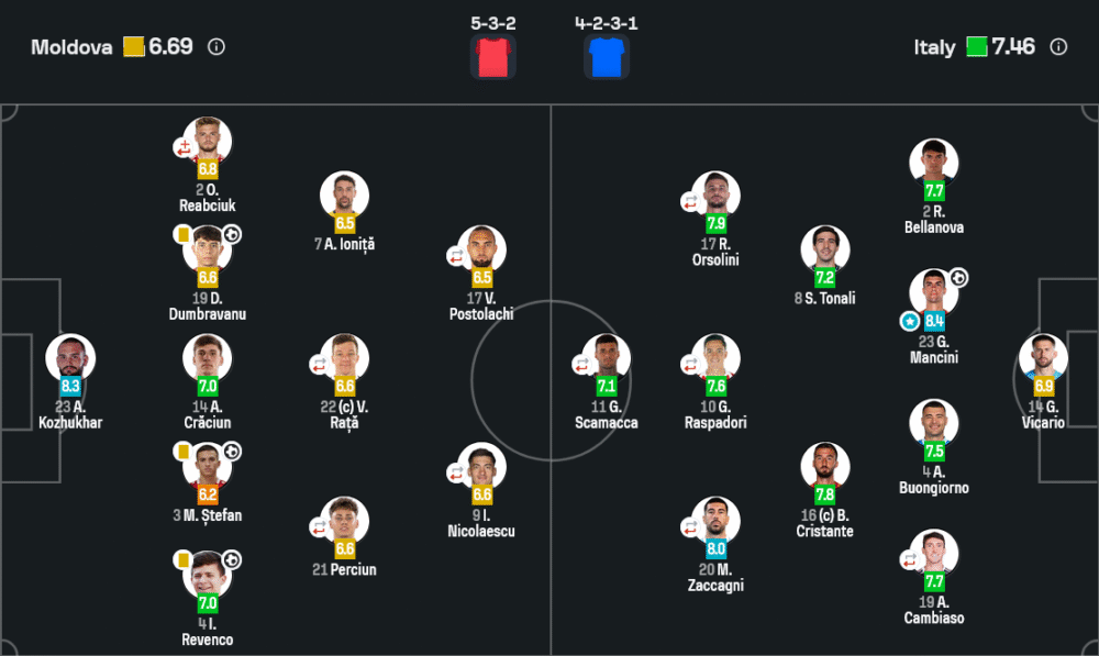 ขณะที่อิตาลีใช้ 4-2-3-1 แบบยืดหยุ่น เวลาได้บอลแบ็กทั้ง เบลลาโนว่า และ คัมเบียโซ จะดันสูงขึ้นไปจนเหมือนเป็นปีก สร้างสถานการณ์ “โอเวอร์โหลด” ด้านข้างให้กับแนวรับห้าคนของมอลโดวา กลางสองคนอย่าง โตนาลี–คริสตันเต้ รับบทจ่ายบอลสั้นไล่หาช่อง ทำเกมสลับซ้าย–ขวาเพื่อดึงตัวประกบและรอจังหวะเปิดคัทแบ็กหรือหยอดเข้ากรอบเขตโทษ