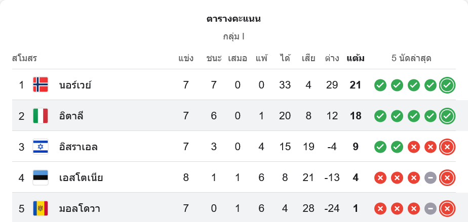 - อิตาลี พบ นอร์เวย์ – เกมใหญ่ที่อาจตัดสินแชมป์กลุ่มโดยตรง แฟนอัซซูร์รีต้องลุ้นเต็มที่ หากชนะได้จะทำให้สถานการณ์พลิกทันที