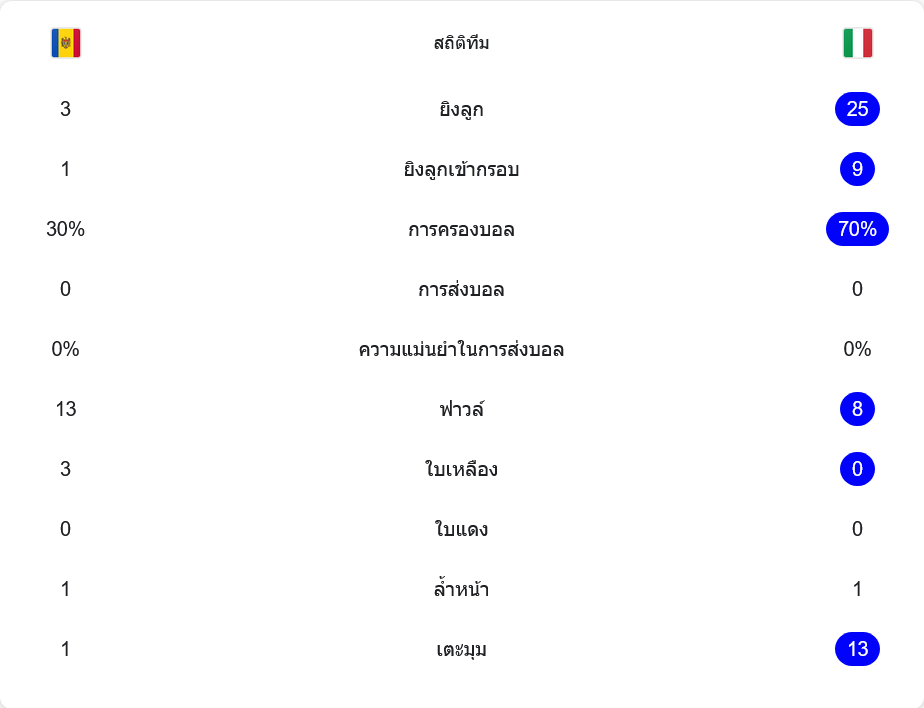ตัวเลขหลังเกมสะท้อนภาพชัดเจนว่าอิตาลีครองเกมอยู่ฝ่ายเดียว พวกเขายิงรวมถึง 25 ครั้ง เข้ากรอบ 9 ครั้ง ขณะที่มอลโดวามีโอกาสเพียง 3 ครั้ง และเข้ากรอบแค่ลูกเดียวเท่านั้น การครองบอลก็ห่างกันสุดขั้ว เจ้าถิ่นมีเพียง 30% ส่วนอิตาลียึดเกมไว้ถึง 70% เล่นบอลกันอยู่แดนคู่แข่งเป็นส่วนใหญ่