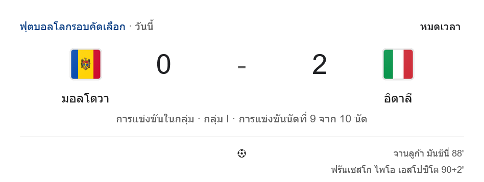 บ้านกีฬา พาเกาะจอเช็ก ผลบอลสด เกมฟุตบอลโลก 2026 รอบคัดเลือก โซนยุโรป กลุ่ม I ที่สนามสต๊าด เดอ ลักเซมเบิร์ก มอลโดวาเปิดรังรับการมาเยือนของทีมชาติอิตาลี เกมนี้ลูกทีมของเจนนาโร่ กัตตูโซ่ต้องการชัยชนะเพื่อกดดันนอร์เวย์จ่าฝูง และสุดท้ายพวกเขาก็ทำได้ บดเอาชนะ 2-0 จากประตูช่วงท้ายเกมของ จานลูก้า แมนชินี และ ฟรานเชสโก้ ปิโอ เอสโปซิโต้ ทำให้ในมุมมองของสายเช็ก บ้านผลบอล นี่คือเกมที่อิตาลีเล่นเหนือกว่าทั้งรูปและสกอร์แบบไม่เผื่อหน้า