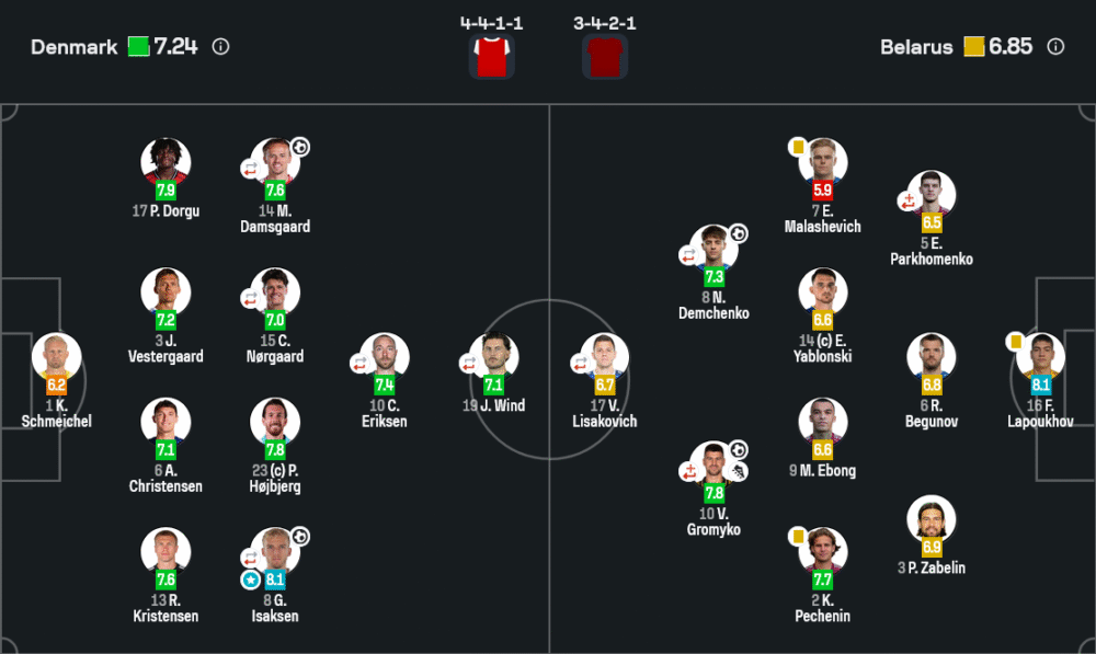 🇩🇰 เดนมาร์ก (4-4-1-1) – เรตติ้งเฉลี่ย 7.24