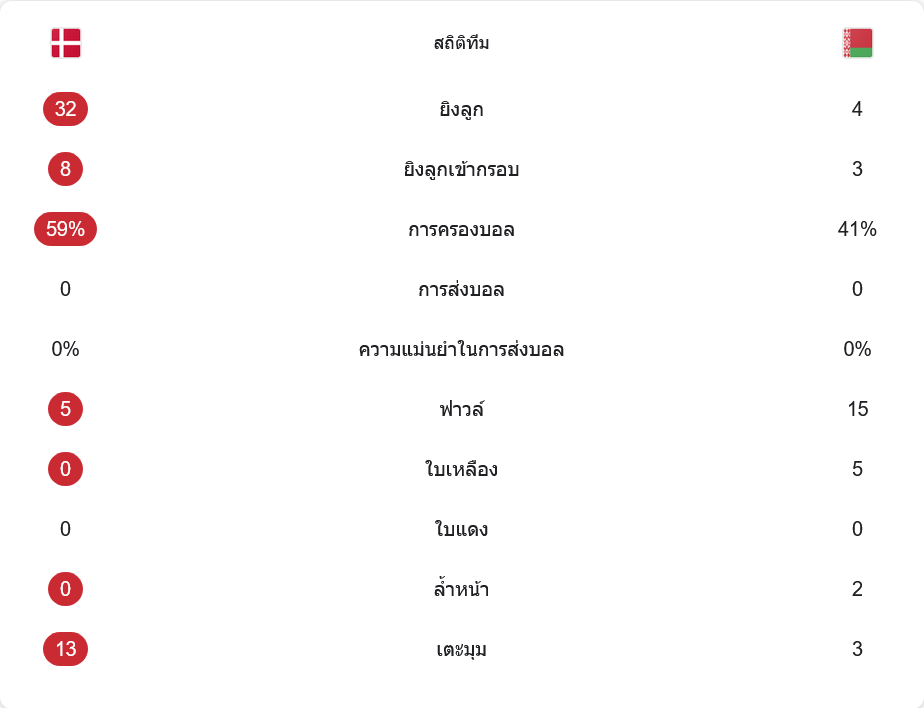 จุดที่น่าสนใจคือจำนวนฟาวล์และใบเหลือง เบลารุสทำฟาวล์ถึง 15 ครั้ง ได้ใบเหลืองถึง 5 ใบ ขณะที่เดนมาร์กฟาวล์แค่ 5 ครั้ง ไม่มีใบเหลืองเลย สะท้อนภาพชัดว่าเจ้าบ้านเล่นบอลเน้นเกมบุกล้วน ๆ ส่วนทีมเยือนต้องใช้การหยุดเกมและตัดฟาวล์เพื่อต่อชีวิตหลายครั้ง นอกจากนี้ เดนมาร์กยังได้เตะมุมมากถึง 13 ครั้ง เทียบกับเบลารุสแค่ 3 ครั้ง แต่อย่างที่เห็น โอกาสเยอะแต่ไม่คมทำให้ต้องยอมรับผลเสมอแบบเจ็บ ๆ