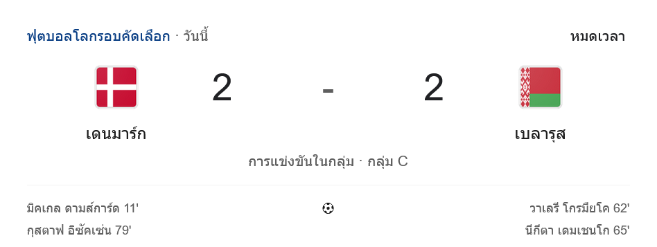 จาก : ผลบอลสด ฟุตบอลโลก 2026 รอบคัดเลือก โซนยุโรป ระหว่าง เดนมาร์ก 2-2 เบลารุส วันนี้ 16/11/68 – บ้านกีฬา