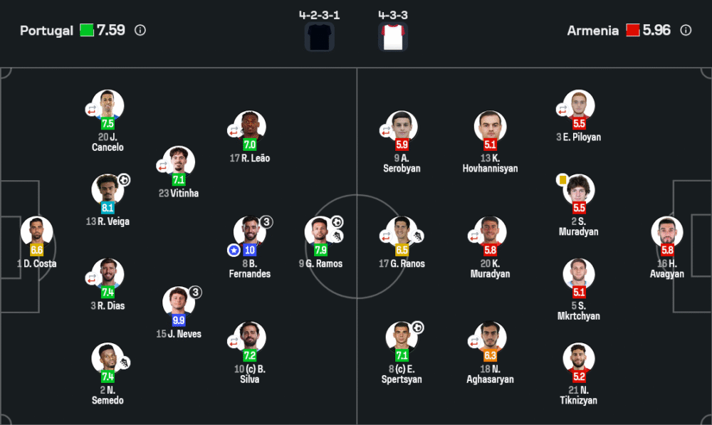 ฝั่งโปรตุเกสแทบทุกคนฟอร์มจัดจ้าน แต่ตัวโดดเด่นชัดเจนคือ บรูโน่ แฟร์นันด์ส กับ ชูเอา เนเวส ขณะที่ฝั่งอาร์เมเนียมีเพียง สเปียร์ตยาน ที่ยังพอสร้างความปั่นป่วนได้บ้าง