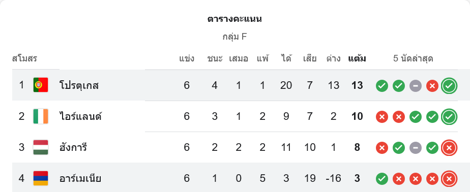 โปรแกรมในกลุ่ม F นัดต่อ ๆ ไป แฟนบอลต้องจับตาโดยเฉพาะเกมที่โปรตุเกสจะออกไปเยือนคู่แข่งโดยตรงอย่าง ไอร์แลนด์ และ ฮังการี ซึ่งจะมีผลโดยตรงต่อการลุ้นแชมป์กลุ่ม แม้ในภาพข้อมูลจะยังไม่ได้ระบุวันเตะถัดไปชัดเจน แต่สำหรับสายเช็ก ตารางบอล และ โปรแกรมบอล บนหน้าเว็บกีฬา ต่างก็เตรียมรออัปเดตคิวเตะของฝอยทองกันแบบเรียลไทม์แน่นอน