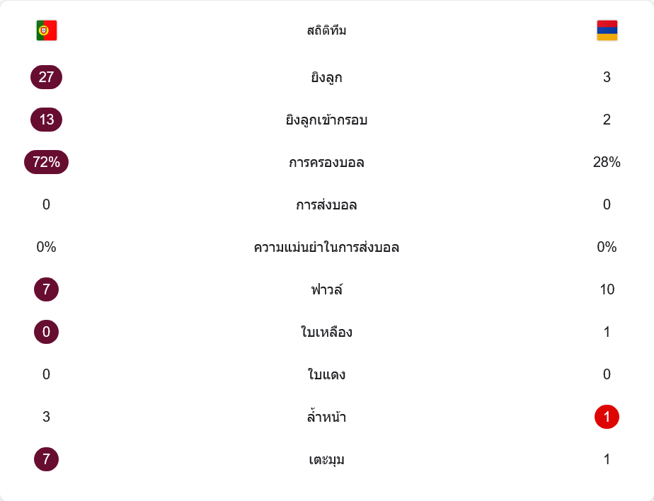 ตัวเลขท้ายเกมสะท้อนทุกอย่างชัดเจน โปรตุเกสครองบอลถึง 72% ขณะที่อาร์เมเนียได้แค่ 28% เท่านั้น เจ้าถิ่นยิงรวม 27 ครั้ง เข้ากรอบถึง 13 โหมบุกแทบตลอด 90 นาที ส่วนทีมเยือนยิงได้เพียง 3 ครั้ง เข้ากรอบ 2 ครั้ง และหนึ่งในนั้นคือประตูตีเสมอ 1-1