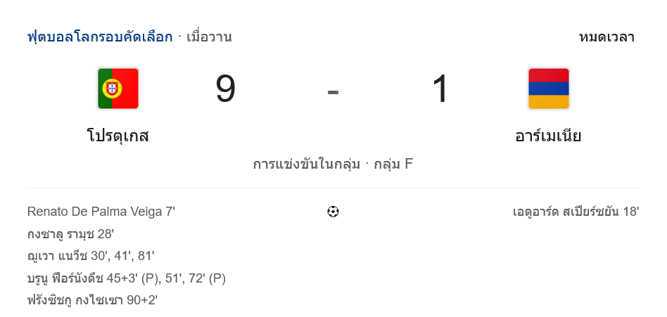 จาก : ผลบอลสด ฟุตบอลโลก 2026 รอบคัดเลือก โซนยุโรป ระหว่าง โปรตุเกส 9-1 อารเมเนีย วันนี้ 16/11/68 – บ้านกีฬา