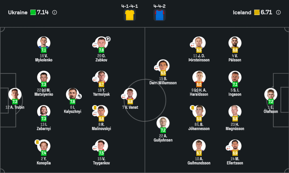 ไอซ์แลนด์เองก็มีการขยับตัวสำรองในนาที 86 ส่ง ดาเนียล ทริสตาน กุ๊ดยอห์นเซน กับ โลกี้ โทมาสสัน ลงมาแทน ธอร์สไตน์สสัน และ เอลเลิร์ตสสัน หวังยกระดับเกมสวนกลับช่วงท้าย แต่แผนกลับโดนยูเครนลงโทษแทน