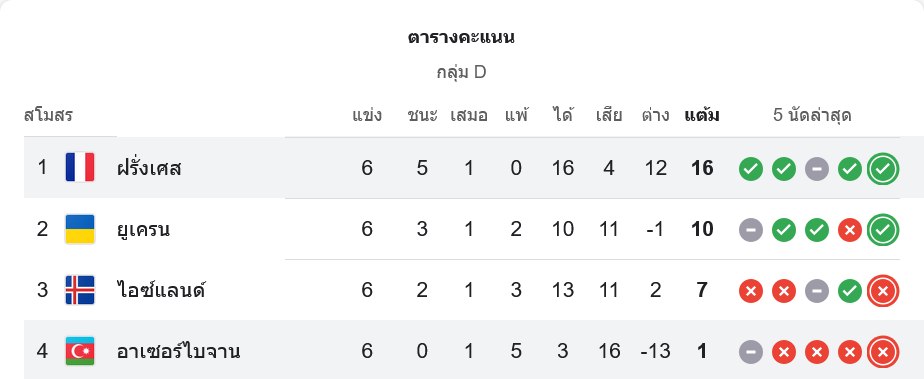 ด้าน อาเซอร์ไบจาน สถานการณ์ค่อนข้างหนัก แข่ง 6 นัดยังสะกดคำว่าชนะไม่เจอ เสมอ 1 แพ้ 5 มีเพียง 1 แต้ม ประตูได้ 3 เสียไปแล้ว 16 ลูก ลูกได้เสีย -13 รั้งบ๊วยของกลุ่ม D แบบเต็มตัว ต้องกลับไปเคลียร์เกมรับและความผิดพลาดส่วนตัวให้เร็วที่สุดหากหวังมีแต้มในนัดต่อ ๆ ไป ขณะที่ ยูเครน และ ไอซ์แลนด์ ยังต้องลุ้นหนักในการเบียดกันรองจ่าฝูงตามหลังฝรั่งเศสอยู่ห่างพอสมควร