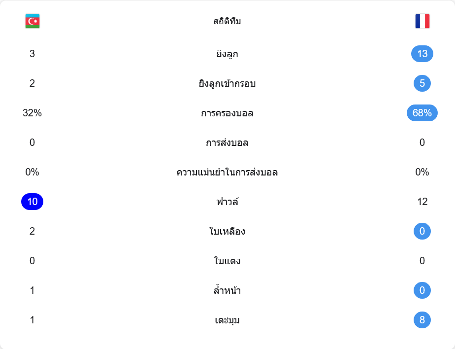 แม้จำนวนฟาวล์ของอาเซอร์ไบจานจะมากกว่า 10 ต่อ 12 ของฝรั่งเศส แต่ก็ไม่ได้ทำให้เกมรุกตราไก่ชะงักลง แถมเจ้าบ้านยังโดนใบเหลืองถึง 2 ใบ ขณะที่ฝรั่งเศสเล่นกันค่อนข้างเนียน ไม่มีใบเหลืองเลย ส่วนลูกเตะมุม ฝรั่งเศสได้ถึง 8 ครั้ง ตอกย้ำว่าบุกกดอยู่ฝั่งเดียว ขณะที่อาเซอร์ไบจานมีแค่ 1 ครั้งเท่านั้น สถิติเหล่านี้ยืนยันว่าชัยชนะ 3-1 ไม่ได้เกิดจากโชคช่วย แต่เป็นผลจากการควบคุมเกมที่เหนือกว่าทุกมิติ