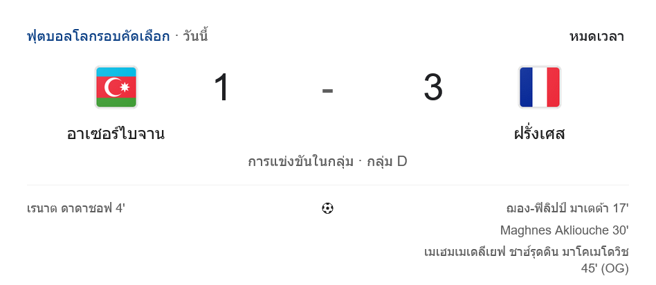 - 😱 45′ เชาห์รูดดิน มาฮัมมาดาลีเยฟ ทำเข้าประตูตัวเอง ส่งฝรั่งเศสนำห่าง 3-1