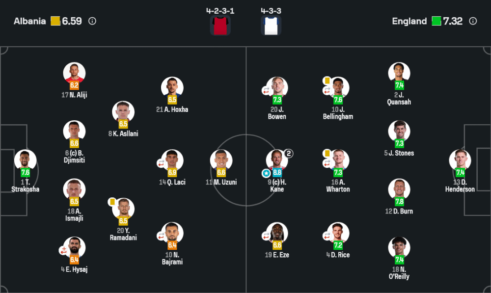 ไม่ต้องสงสัยว่าใครคือพระเอกของค่ำคืนนี้ แฮร์รี เคน กัปตันทีมชาติอังกฤษรับคะแนนสูงสุด 8.8 จากการเหมาสองประตูในช่วงเวลาที่ทีมต้องการความเด็ดขาด ลูกแรกคือการยิงเปิดหัวจากจังหวะกดดันต่อเนื่อง ช่วยปลดล็อกแนวรับที่เหนียวแน่นของแอลเบเนีย ส่วนประตูที่สองคือการจบสกอร์แบบกองหน้าระดับโลก รับบอลจากแรชฟอร์ดแล้วซัดจบแบบไม่เปิดโอกาสให้สตราโคชาคิดอะไร