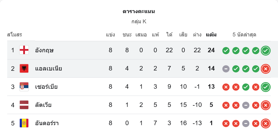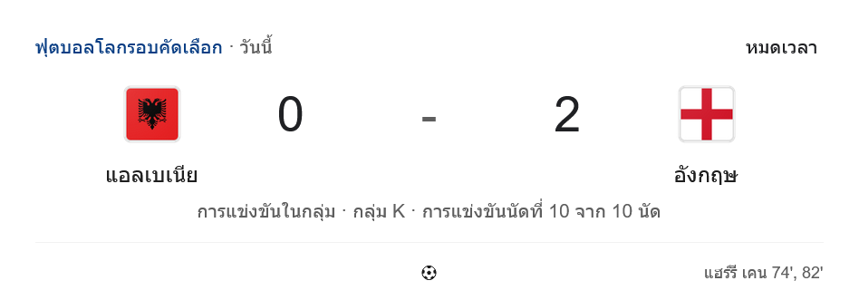 จาก : ผลบอลสด ฟุตบอลโลก 2026 รอบคัดเลือก โซนยุโรป ระหว่าง แอลเบเนีย 0-2 อังกฤษ วันนี้ 17/11/68 – บ้านกีฬา