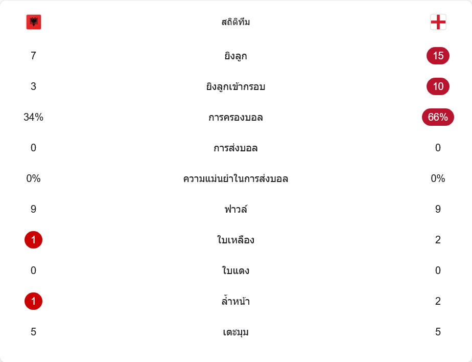 ตัวเลขหลังเกมบอกเรื่องราวชัดเจน แอลเบเนียมีโอกาสยิงเพียง 7 ครั้ง เข้ากรอบ 3 ขณะที่อังกฤษกดไปถึง 15 ครั้ง เข้ากรอบถึง 10 ลูก แสดงให้เห็นถึงการสร้างสรรค์โอกาสและความกดดันที่ยิงเข้าใส่เจ้าถิ่นแบบต่อเนื่อง การครองบอลยิ่งชัดเจน อังกฤษยึดเกมไว้ 66% ทิ้งห่างแอลเบเนียที่มีแค่ 34% เท่านั้น ซึ่งทำให้จังหวะเล่นของเจ้าบ้านส่วนใหญ่เป็นการตั้งรับลึกแล้วหวังบอลยาวสวนกลับมากกว่า