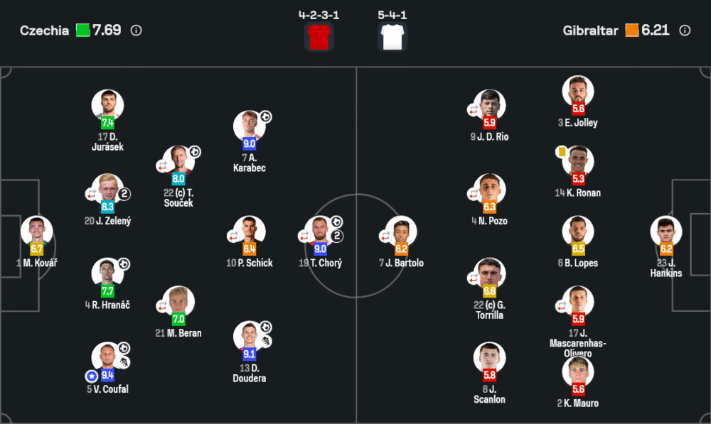 นักเตะที่โดดเด่นที่สุดฝั่งเช็กแน่นอนว่าคือ คูฟาล กับ ดูเดร่า ที่ทำเกมรุกริมเส้นโหดจัด ขณะที่ฝั่งยิบรอลตาร์ แม้แดน เบนท์ กับ ทอร์ริยา จะพยายามไล่วิ่งไล่บี้ แต่ก็ไม่สามารถต้านคุณภาพของเจ้าถิ่นได้เลย