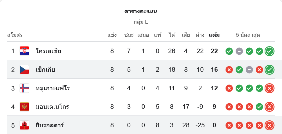 📌 สถานการณ์ในตารางคะแนนฟุตบอลโลก 2026 รอบคัดเลือก กลุ่ม L