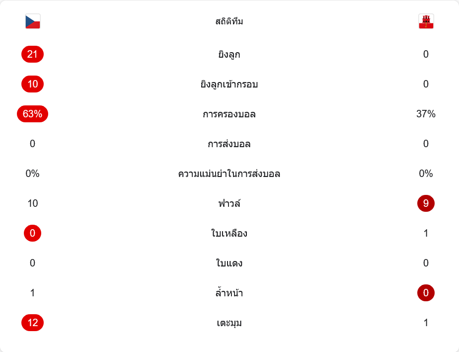 ตัวเลขหลังจบเกมบอกชัดว่าเช็กครองเกมเบ็ดเสร็จ พวกเขายิงทั้งหมด 21 ครั้ง เข้ากรอบ 10 ครั้ง และเปลี่ยนเป็น 6 ประตูเต็ม ๆ ขณะที่ยิบรอลตาร์ไม่มีแม้แต่โอกาสยิงสักครั้งเดียว การครองบอลเช็กอยู่ที่ 63% ต่อ 37% ของทีมเยือน เกมรับของเจ้าถิ่นแทบไม่ต้องออกแรงหนัก มีเพียงการตัดฟาวล์ 10 ครั้งเพื่อหยุดสวนกลับ ส่วนยิบรอลตาร์ทำฟาวล์ 9 ครั้งและโดนใบเหลืองหนึ่งใบจาก เคียน โรแนน การบุกของเช็กยังได้ลูกเตะมุมถึง 12 ครั้ง เทียบกับยิบรอลตาร์แค่ 1 ครั้งเท่านั้น สถิติทั้งหมดจึงสรุปง่าย ๆ ว่านี่คือค่ำคืนที่ทีมเจ้าบ้านเล่นฟุตบอลคนละระดับกับผู้มาเยือนอย่างแท้จริง