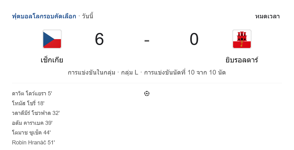 จาก : ผลบอลสด ฟุตบอลโลก 2026 รอบคัดเลือก โซนยุโรป ระหว่าง สาธารณรัฐเช็ก 6-0 ยิบรอลตาร์ วันนี้ 18/11/68 – บ้านกีฬา