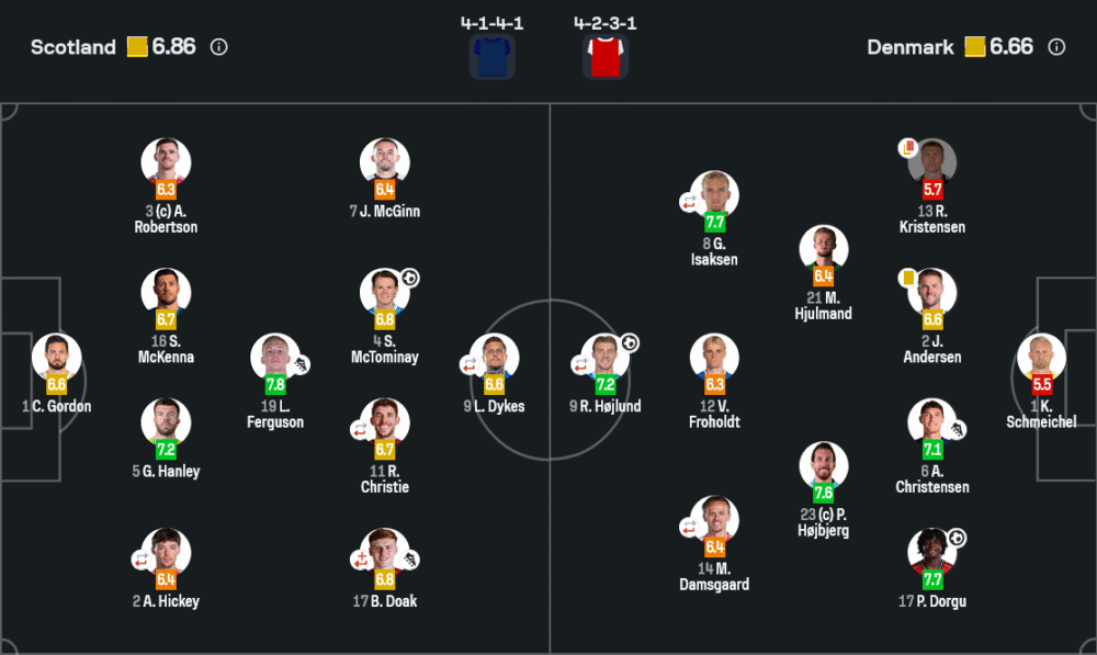 สกอตแลนด์ในระบบ 4-1-4-1 เล่นงานเดนมาร์กด้วยการบีบเพรสซิ่งเร็ว ตั้งบล็อกสูง และอาศัยตัวริมเส้นสปีดจัดอย่าง บิแล็ก โด๊ค และโรเบิร์ตสันเติมขึ้นมาช่วยซ้อน ทำให้แนวรับเดนมาร์กระส่ำตั้งแต่ครึ่งแรก แม้เปอร์เซ็นต์ครองบอลจะเป็นรอง 36% แต่เกมสวนกลับคมกริบกว่าชัดเจน