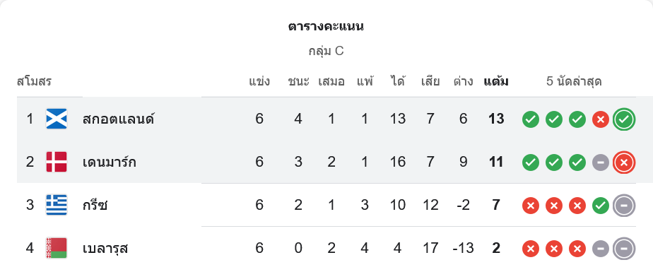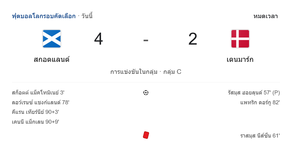 จาก : ผลบอลสด ฟุตบอลโลก 2026 รอบคัดเลือก โซนยุโรป ระหว่าง สกอตแลนด์ 4-2 เดนมาร์ก วันนี้ 19/11/68 – บ้านกีฬา