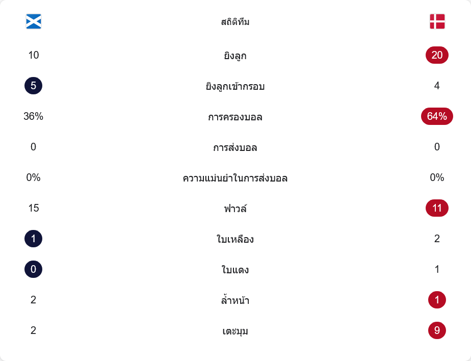 ด้านสกอตแลนด์แม้ครองบอลแค่ 36% แต่เล่นเกมเพรสหนัก ทำให้เดนมาร์กต้องผิดพลาดกันเองหลายจังหวะ และจบคมในช่วงท้ายที่สุดโหด
