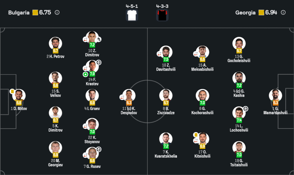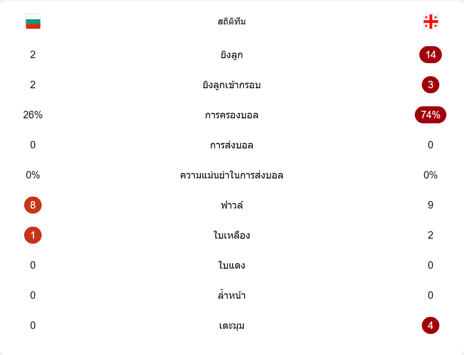 แม้จอร์เจียจะครองบอลกินขาดถึง 74% แต่บัลแกเรียคือทีมที่ทำประตูได้คมกว่า ยิง 2 ครั้ง เข้ากรอบทั้งสอง จอร์เจียยิง 14 ครั้งเข้าเพียง 3 ฟาวล์สูสี 9–8 แต่ใบเหลืองทีมเยือนโดนมากกว่า 2 ใบ ขณะที่ลูกเตะมุมจอร์เจียเหนือกว่า 4–0