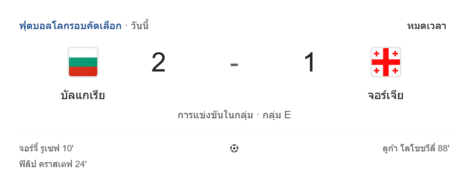 ศึกหนักของกลุ่ม E ในฟุตบอลโลก 2026 รอบคัดเลือก โซนยุโรป จบลงแบบทิ้งดราม่าสนามไว้เต็มลาน เมื่อบัลแกเรียเปิดบ้านอัดจอร์เจียไป 2-1 จากการยิงสุดเฉียบของ “จอร์จี้ รูเซฟ” นาที 10 และ “ฟีลิป คราสเตฟ” นาที 24 ก่อนที่ทีมเยือนจะไล่มาในช่วงท้าย แต่ไม่ทัน ส่งผลให้เกมนี้เดือดจนแฟนบอลพูดถึงกันทั้งสนาม โดยเฉพาะรูปเกมที่พลิกไปมา แม้สถิติจะบ่งบอกว่าบัลแกเรียเป็นรองหนักมาก แต่สุดท้ายกุมชัยชนะได้แบบโคตรโหด