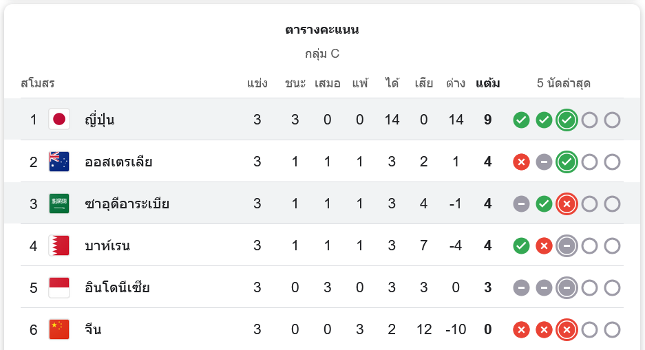 หลังจากชัยชนะนัดนี้ ญี่ปุ่น ยังคงรั้งตำแหน่งจ่าฝูงของกลุ่ม C ด้วยการชนะ 3 นัดรวด มี 9 คะแนนเต็ม ขณะที่ ซาอุดีอาระเบีย อยู่ในอันดับที่ 3 ของตาราง มี 4 คะแนนจาก 3 นัด โดยยังคงต้องพยายามเก็บคะแนนเพิ่มเติมในนัดถัดไปเพื่อมีโอกาสผ่านเข้ารอบต่อไป