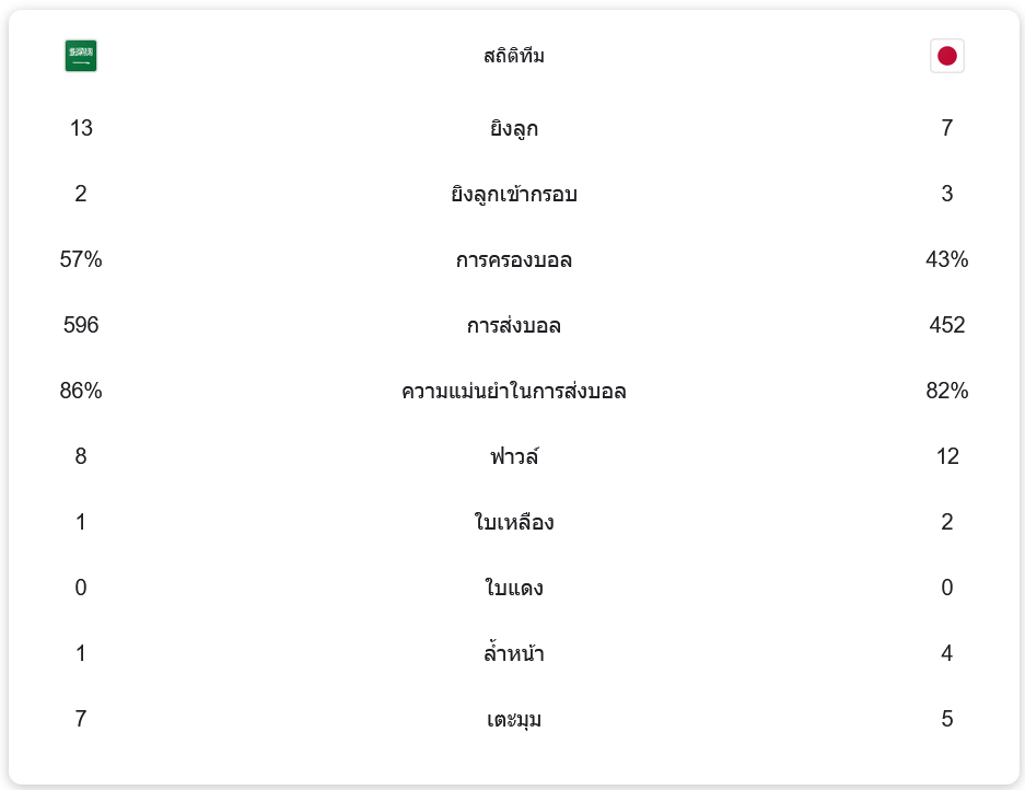 เกมนี้แม้ว่าซาอุดีอาระเบียจะครองบอลได้มากถึง 57% และมีการส่งบอลมากถึง 596 ครั้ง แต่ก็ไม่สามารถเปลี่ยนโอกาสให้เป็นประตูได้ ต่างกับญี่ปุ่นที่ครองบอลเพียง 43% แต่กลับมีความเฉียบคมในการโจมตีมากกว่า โดยญี่ปุ่นมีโอกาสยิง 7 ครั้งและยิงเข้ากรอบ 3 ครั้ง ขณะที่ซาอุดีอาระเบียมีโอกาสยิง 13 ครั้งและเข้ากรอบเพียง 2 ครั้ง