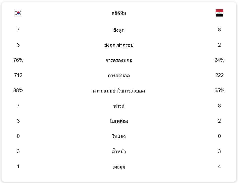 เกาหลีใต้แสดงให้เห็นถึงการครองเกมที่เหนือกว่า ด้วยอัตราการครองบอลถึง 76% และมีการส่งบอลทั้งหมด 712 ครั้ง ขณะที่อิรักครองบอลเพียง 24% และส่งบอลเพียง 222 ครั้ง แม้ว่าอิรักจะมีโอกาสยิงมากกว่า โดยยิงทั้งหมด 8 ครั้ง แต่เข้ากรอบเพียง 2 ครั้ง ขณะที่เกาหลีใต้ยิงเข้ากรอบ 3 จาก 7 ครั้ง เกาหลีใต้ยังมีความแม่นยำในการส่งบอลถึง 88%