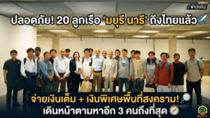 - รับลูกเรือ “มยุรี นารี” กลับบ้านแล้ว 20 ชีวิตถึงไทยปลอดภัย – จ่ายค่าจ้างเต็ม บวกเงินพิเศษพื้นที่สงคราม เดินหน้าตามหาอีก 3 คนให้ถึงที่สุด