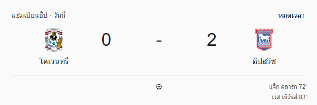 - หมดเวลา: โคเวนทรี 0-2 อิปสวิช