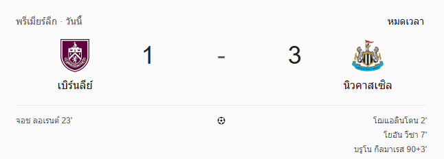 - หมดเวลา: เบิร์นลีย์ 1-3 นิวคาสเซิล