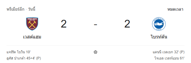 - หมดเวลา: เวสต์แฮม 2-2 ไบรท์ตัน