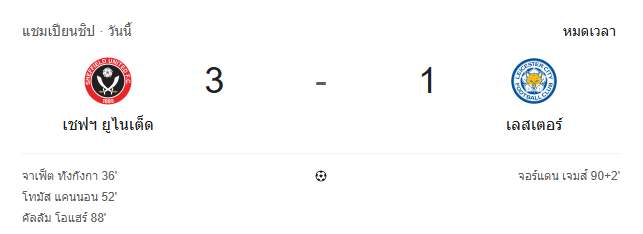 - หมดเวลา: เชฟฟิลด์ ยูไนเต็ด 3-1 เลสเตอร์ ซิตี้