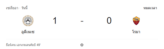 จบ 90 นาที อูดิเนเซ่รักษาสกอร์นำไว้ได้สำเร็จ เอาชนะโรม่า 1-0 เก็บสามแต้มสำคัญในบ้าน เกมนี้แสดงให้เห็นถึงวินัยเกมรับ ความเด็ดขาดในจังหวะสำคัญ และหัวใจนักสู้ของเจ้าถิ่น ขณะที่โรม่าแม้จะครองบอลและบุกมากกว่า แต่จบสกอร์ไม่เฉียบคมพอ ต้องยอมรับความพ่ายแพ้ไปอย่างเจ็บปวด