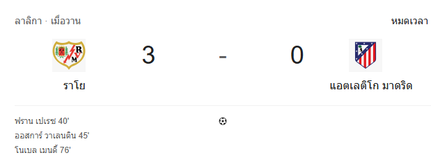 - หมดเวลา: ราโย บาเยกาโน่ 3-0 แอตเลติโก มาดริด