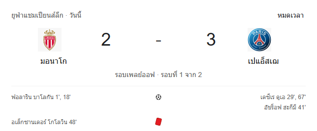 - หมดเวลา: โมนาโก 2-3 เปแอสเช