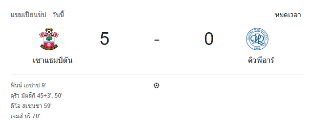 - หมดเวลา: เซาธ์แฮมป์ตัน 5-0 ควีนส์ปาร์ค เรนเจอร์ส