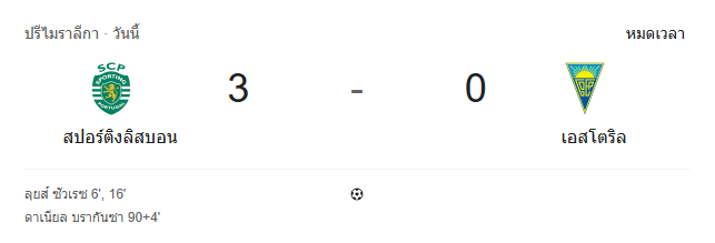 - หมดเวลา: สปอร์ติ้ง ลิสบอน 3-0 เอสโตริล เจ้าถิ่นคมกริบตั้งแต่ครึ่งแรก ก่อนมาย้ำชัยช่วงทดเวลาบาดเจ็บ เก็บสามแต้มแบบขาดลอย