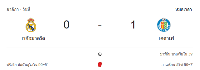 - หมดเวลา: เรอัล มาดริด 0-1 เคตาเฟ่ ทีมเยือนบุกมายิงประตูชัยตั้งแต่ครึ่งแรก ก่อนจะต้านแรงกดดันของราชันชุดขาวได้สำเร็จ แม้เกมจะเดือดช่วงท้ายและมีใบแดงทั้งสองฝั่งก็ตาม