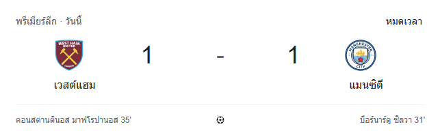 - หมดเวลา: เวสต์แฮม ยูไนเต็ด 1-1 แมนเชสเตอร์ ซิตี้ แมนฯ ซิตี้ขึ้นนำก่อนจาก Bernardo Silva แต่เวสต์แฮมฮึดตีเสมอจาก Mavropanos ก่อนแบ่งแต้มกันไปในเกมที่ทั้งสองทีมมีโอกาสลุ้นหลายครั้ง ⚽