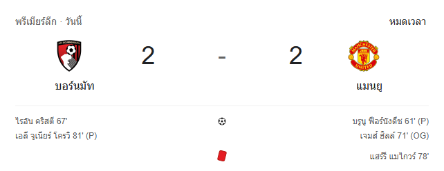- หมดเวลา: บอร์นมัธเปิดบ้านเสมอแมนเชสเตอร์ ยูไนเต็ด 2-2 ในเกมที่มีครบทั้งจุดโทษ, ใบแดง และดราม่าท้ายเกม