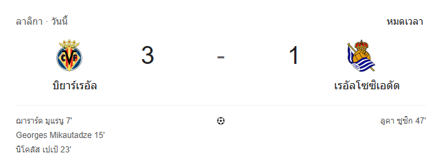 - หมดเวลา: บียาร์เรอัลเปิดบ้านชนะเรอัล โซเซียดาด 3-1 เก็บสามแต้มแบบคมจัดตั้งแต่ครึ่งแรก ก่อนประคองเกมจนปิดงานได้สำเร็จ