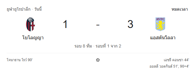 บ้านกีฬา พาสรุป ผลบอลสด ศึก ยูโรปา ลีก รอบ 8 ทีม นัดแรก คู่ระหว่าง โบโลญญ่า 1-3 แอสตัน วิลล่า เกมนี้บอกเลยว่าเจ้าถิ่นไม่ได้เล่นแย่ แต่โดนความเฉียบขาดของทีมเยือนลงโทษแบบเต็ม ๆ วิลล่าใช้โอกาสสำคัญไม่เปลือง ยิงตรงเวลา กัดไม่ปล่อย และบุกมาคว้าชัยด้วยสกอร์ที่หนักเอาเรื่อง ทำให้กุมความได้เปรียบก่อนกลับไปเล่นนัดต่อไปแบบโคตรสำคัญ เป้าสกอร์และผู้ทำประตูตรงกันกับรายงานของยูฟ่าและเดอะการ์เดียนว่า เอซรี คอนซ่า ยิงเปิด, โอลลี่ วัตกิ้นส์ เหมาสอง, ส่วนโจนาธาน โรว์ ยิงคืนให้โบโลญญ่าได้หนึ่งเม็ด