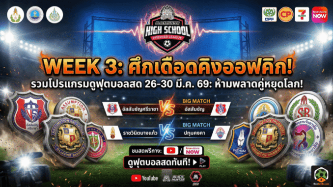 ศึก ฟุตบอลนักเรียน ระดับหัวกะทิกลับมาระเบิดความมันกันต่อในรายการ Black Hunter High School Premier League Week 3 โดยโปรแกรมรอบนี้อัดแน่นตลอดช่วงวันที่ 26-30 มีนาคม 2569 จัดแข่งขันกัน 4 วัน 4 สนาม และมีคู่บิ๊กแมตช์ให้แฟนบอลเยาวชนตามลุ้นกันแบบต่อเนื่อง ใครกำลังมองหาโปรแกรม ดูฟุตบอลสด วันนี้ หรืออยากเช็กคิวล่วงหน้าว่าทีมดังโรงเรียนไหนลงสนามเมื่อไร บทความนี้สรุปมาให้ครบ อ่านง่าย จบในที่เดียว