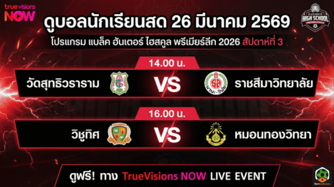 ศึก ฟุตบอลนักเรียน รายการใหญ่ของประเทศอย่าง แบล็ค ฮันเตอร์ ไฮสคูล พรีเมียร์ลีก 2026 เดินหน้าสู่สัปดาห์ที่ 3 อย่างเข้มข้น โดยโปรแกรมวันพฤหัสบดีที่ 26 มีนาคม 2569 มีคิวลงสนาม 2 คู่เดือดที่แฟนบอลห้ามพลาด เพราะแต่ละทีมต่างต้องการแต้มเพื่อขยับอันดับในตาราง