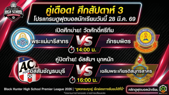 ดูฟุตบอลนักเรียนสด 28 มีนาคม 2569 โปรแกรม Black Hunter High School Premier League 2026 สัปดาห์ 3 เช็กคู่เดือด เวลาแข่ง และช่องทางรับชมครบที่นี่