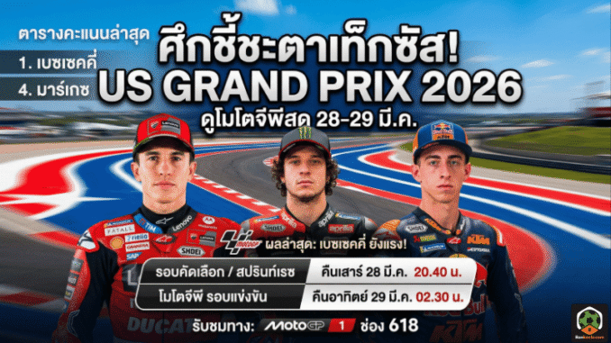 ศึก โมโตจีพี 2026 เดินหน้าความมันต่อเนื่อง โดยคืนวันเสาร์ที่ 28 มีนาคม 2569 แฟนความเร็วมีคิวลุ้นกันยาวในสนามที่ 2 ยูเอสเอ กรังด์ปรีซ์ 2026 ที่ เซอร์กิต ออฟ เดอะอเมริกา รัฐเท็กซัส สหรัฐอเมริกา ซึ่งมีทั้งรอบฝึกซ้อม รอบคัดเลือก และสปรินท์เรซให้ติดตามแบบครบถ้วน ใครกำลังหาโปรแกรม ดูโมโตจีพีสด วันนี้ หรือเช็ก ผลโมโตจีพี ล่าสุด รวบไว้ให้แล้วแบบอ่านง่าย